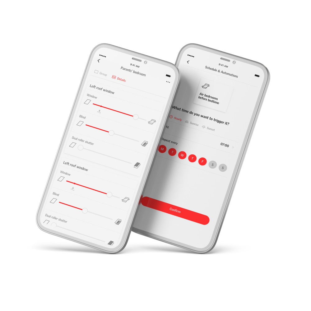 VELUX App Control fornisce il pieno controllo di tutti i prodotti direttamente tramite il telefono. Consente di aprire e chiudere le finestre per tetti, le tende e le tapparelle ad azionamento elettrico e a energia solare con un solo tocco.